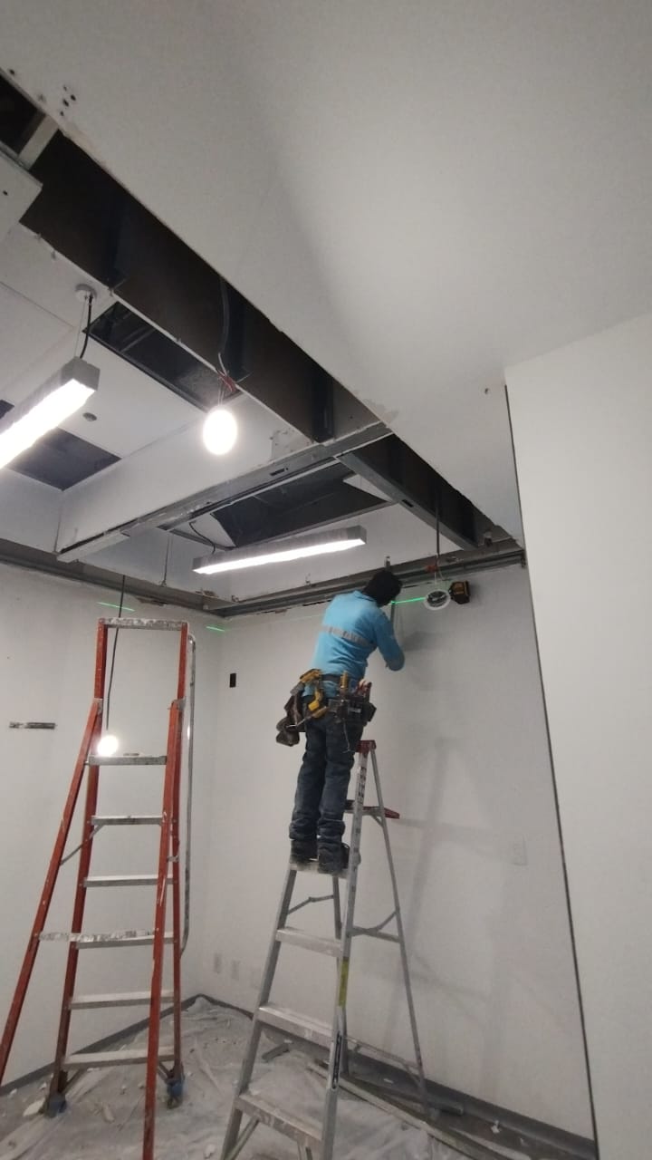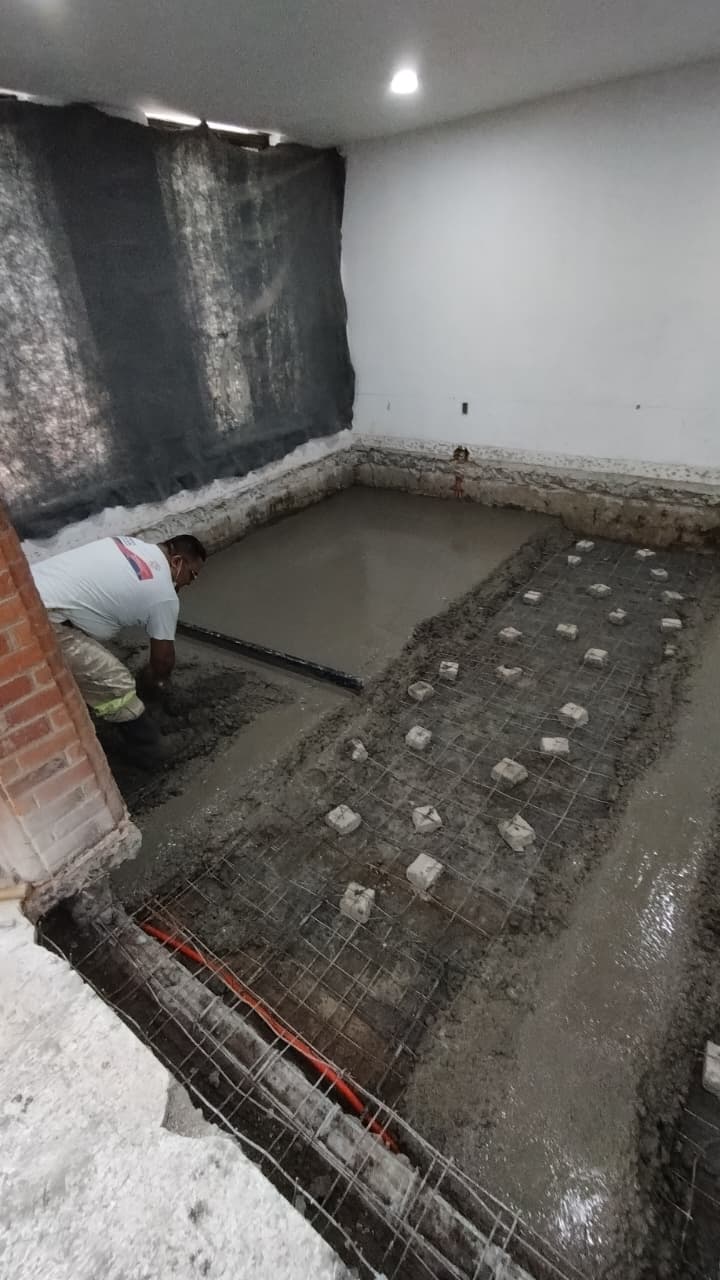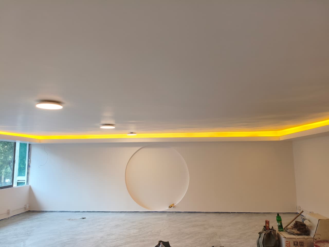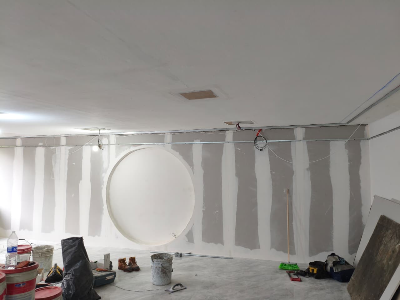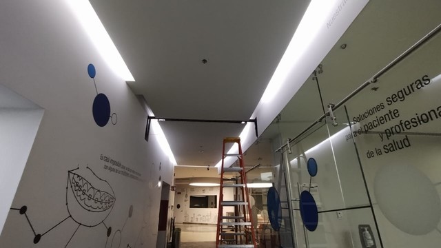Adecuación de local comercial para estudio de pilates. El proyecto integró la renovación de acabados cerámicos en superficies, construcción de cajillos de tablaroca con iluminación LED, carpintería metálica en vidrio templado y la habilitación de instalaciones eléctricas especializadas para equipo deportivo.