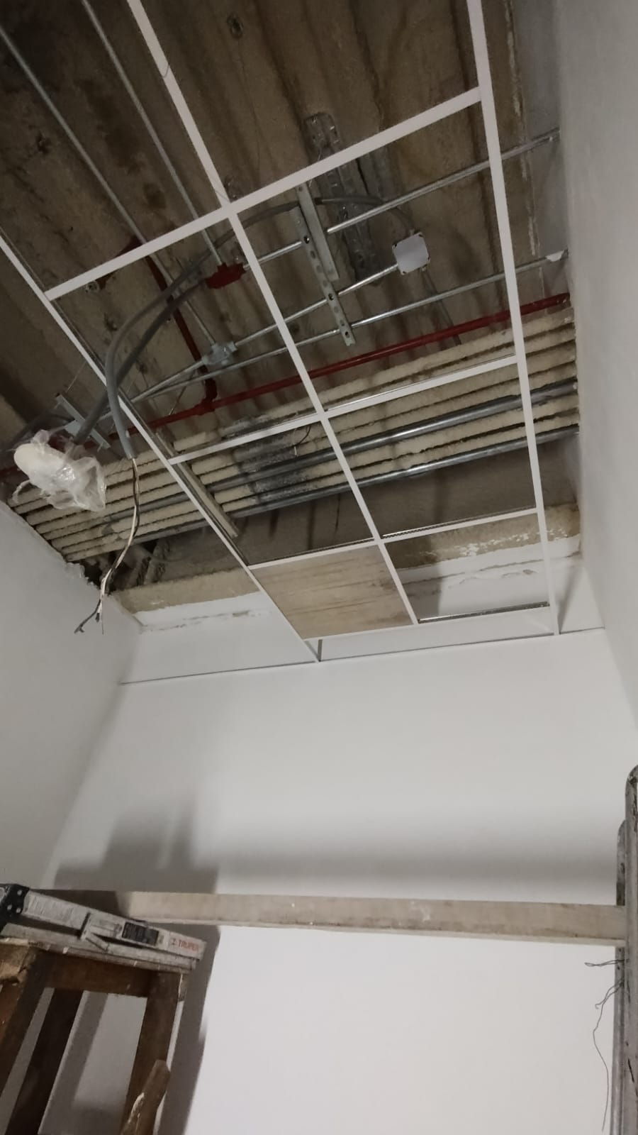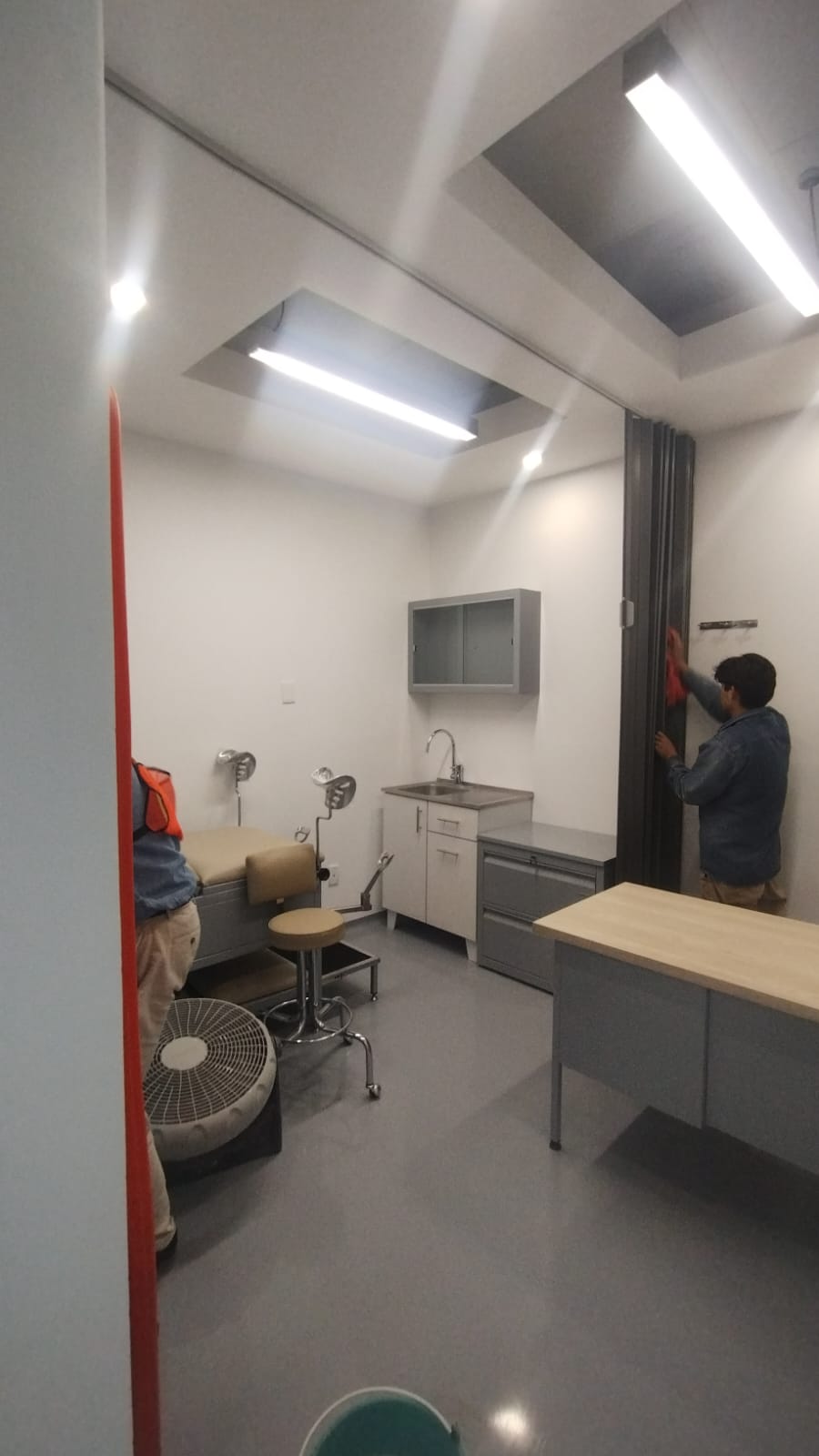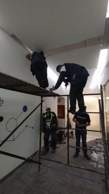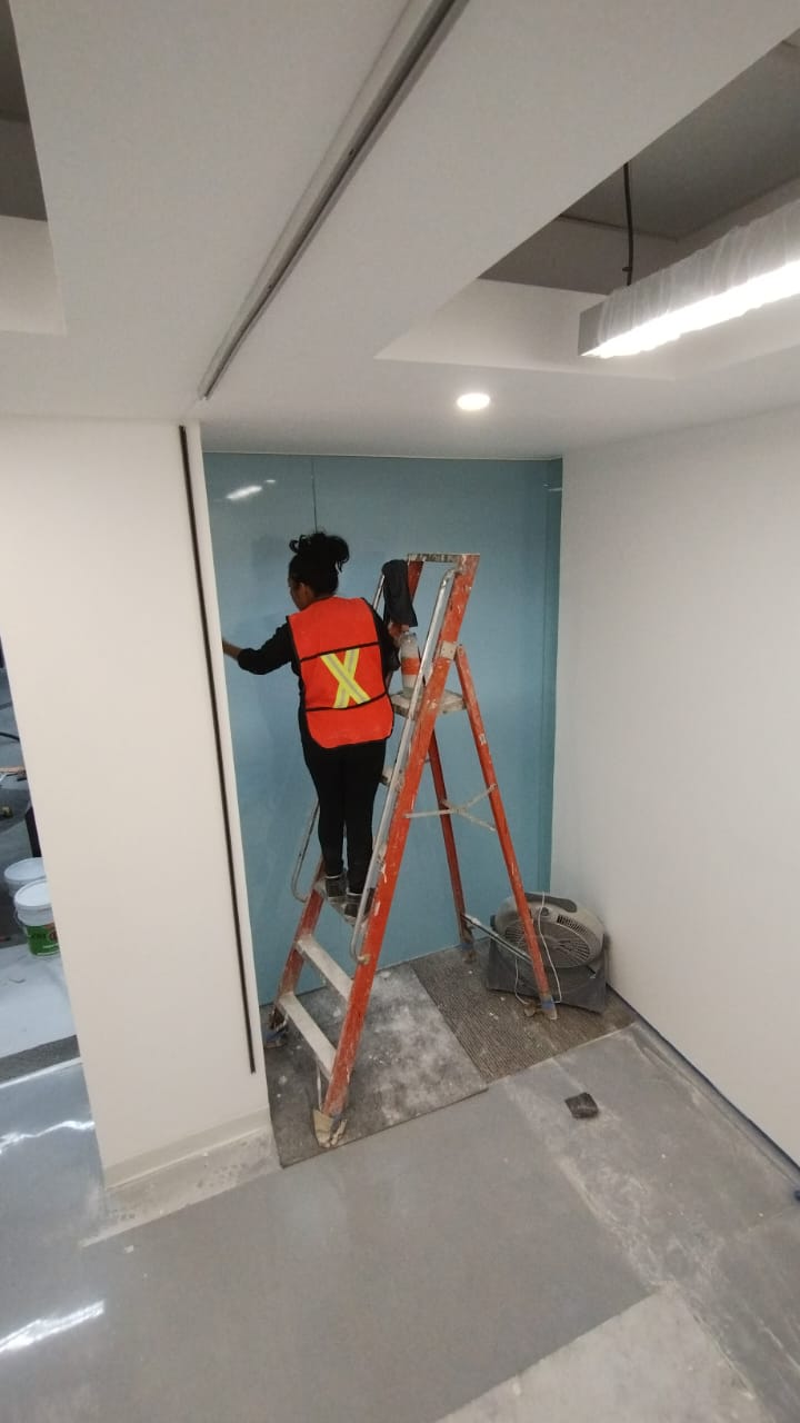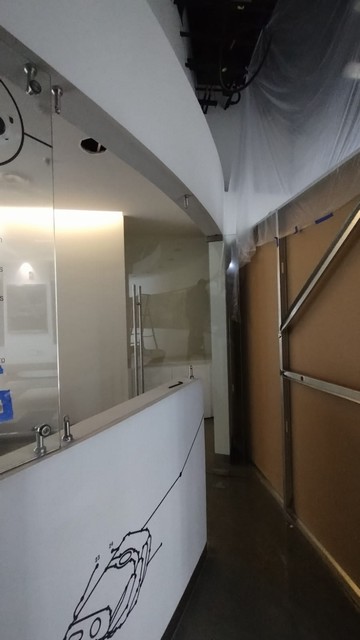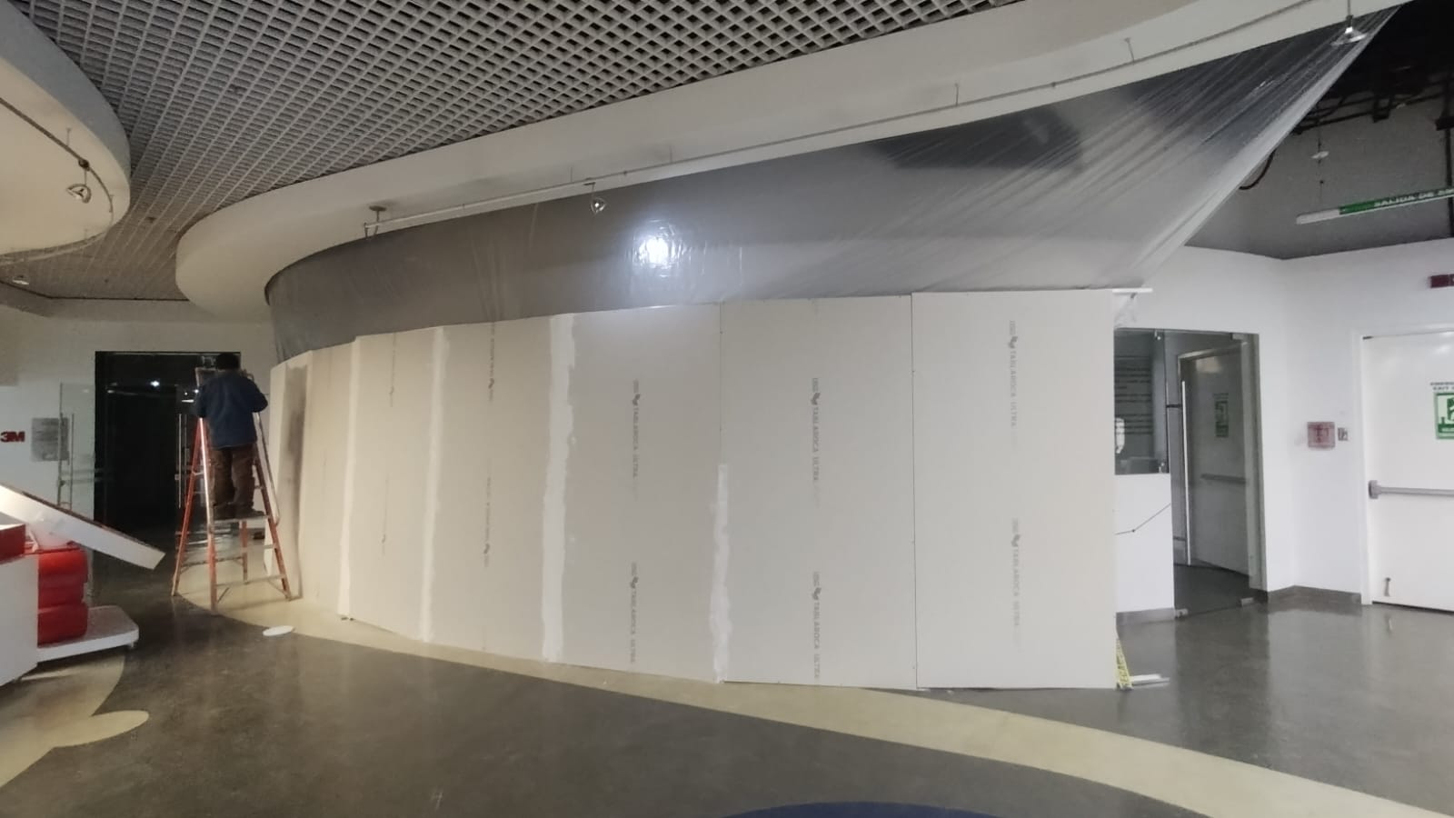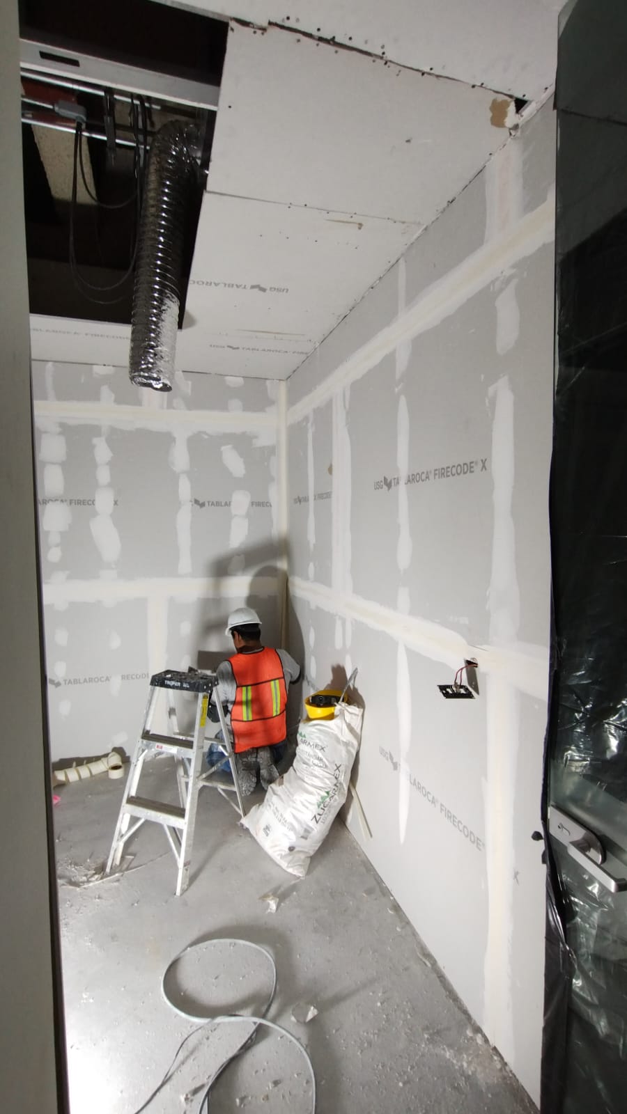 Adecuación de local comercial para estudio de pilates. El proyecto integró la renovación de acabados cerámicos en superficies, construcción de cajillos de tablaroca con iluminación LED, carpintería metálica en vidrio templado y la habilitación de instalaciones eléctricas especializadas para equipo deportivo.
