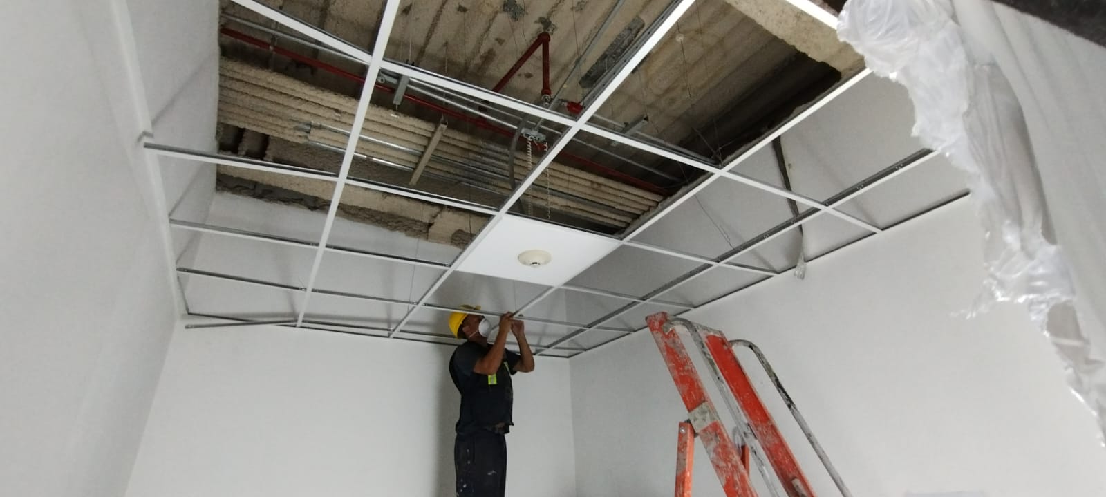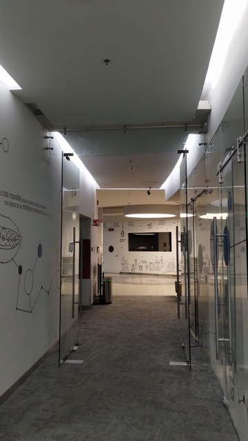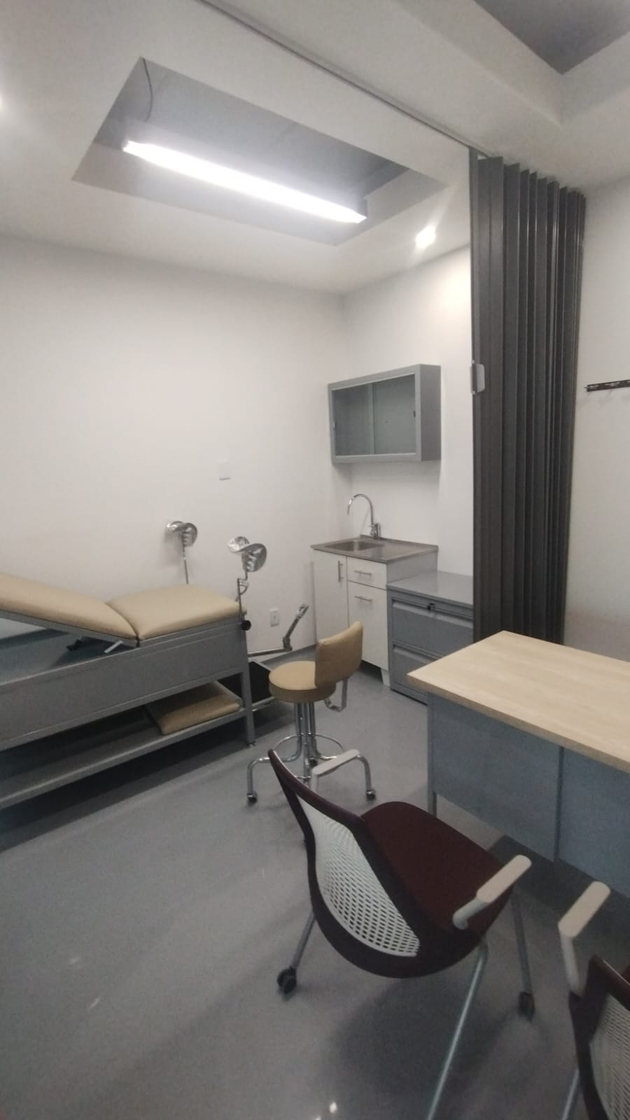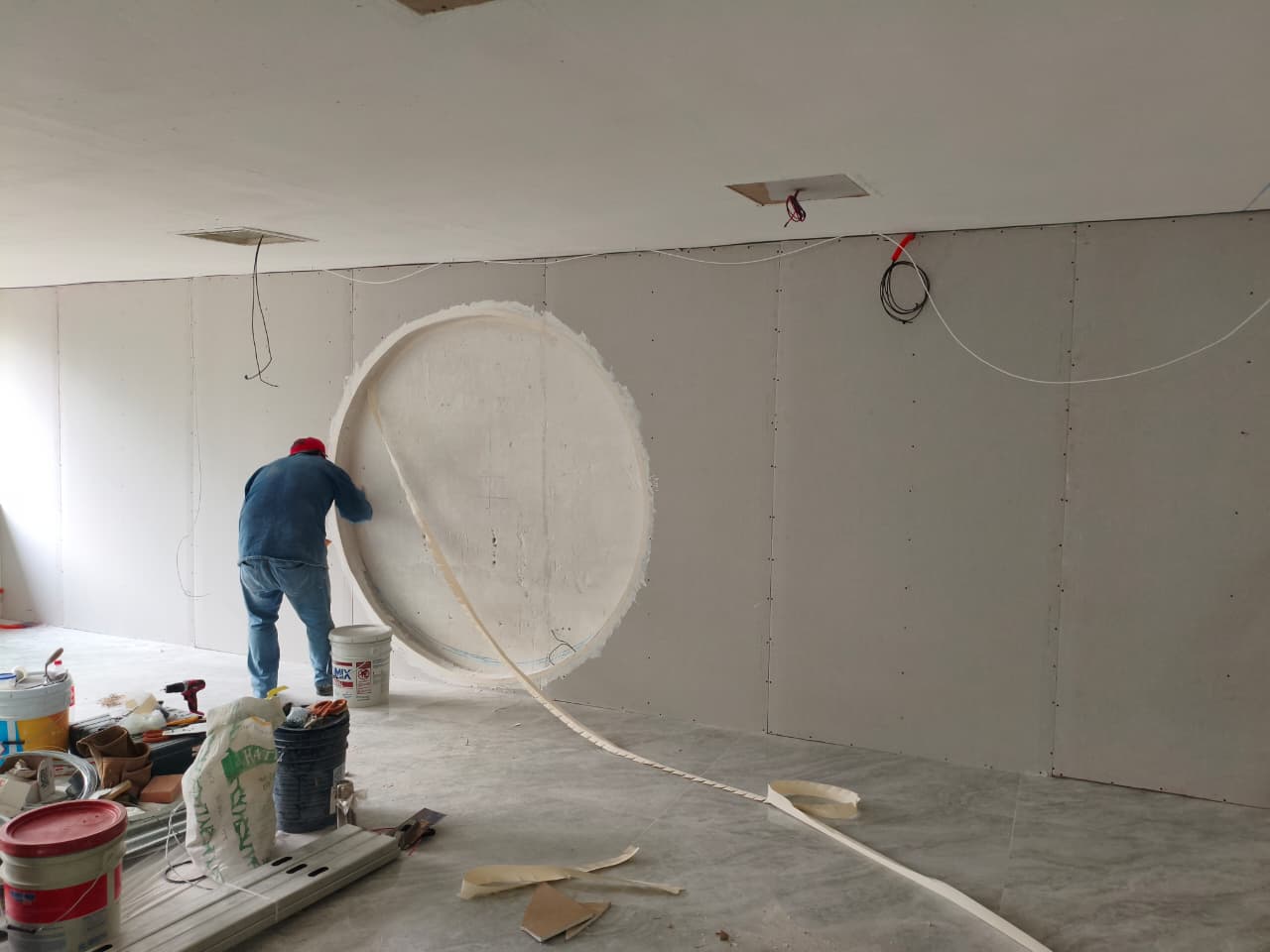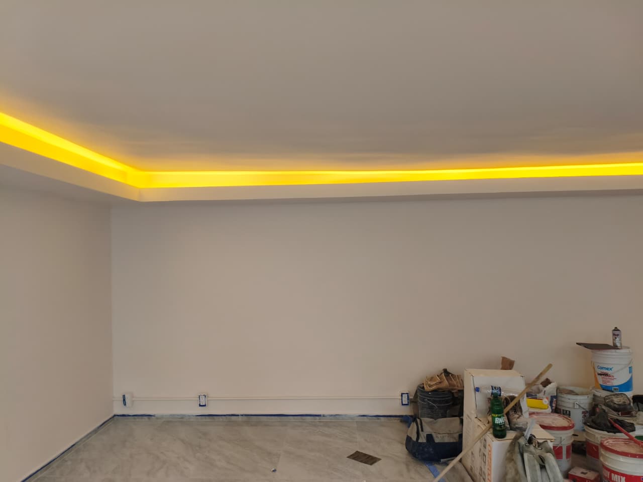 Adecuación de local comercial para estudio de pilates. El proyecto integró la renovación de acabados cerámicos en superficies, construcción de cajillos de tablaroca con iluminación LED, carpintería metálica en vidrio templado y la habilitación de instalaciones eléctricas especializadas para equipo deportivo.